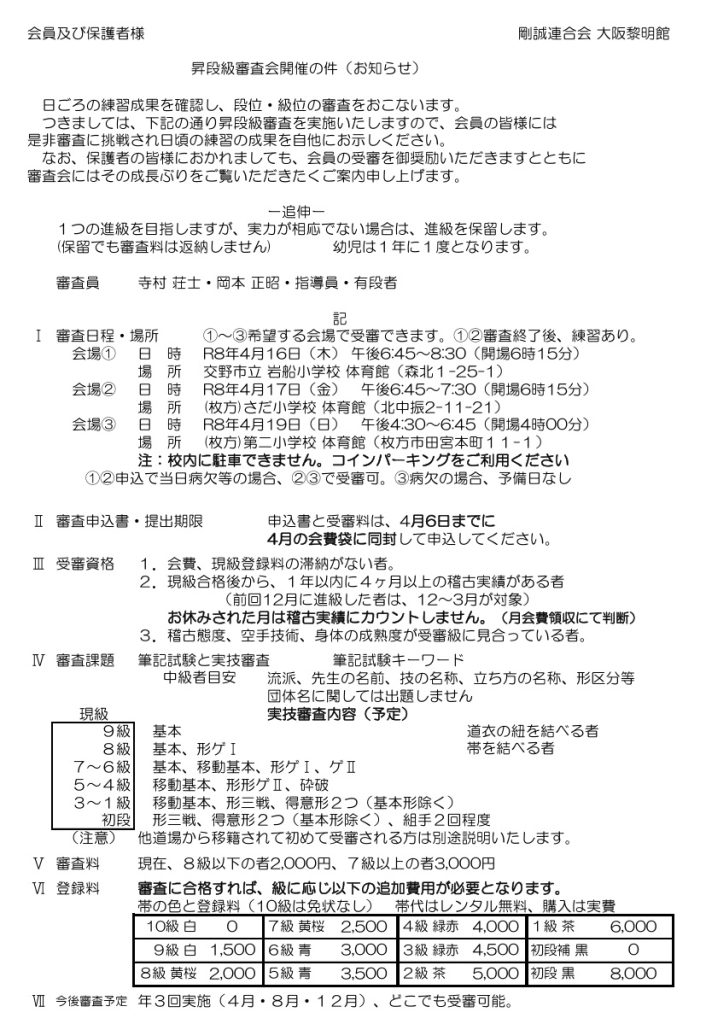 受審資格:前回の進級から1年以内に4ヶ月間の稽古実績がある者(今回は12月~3月)