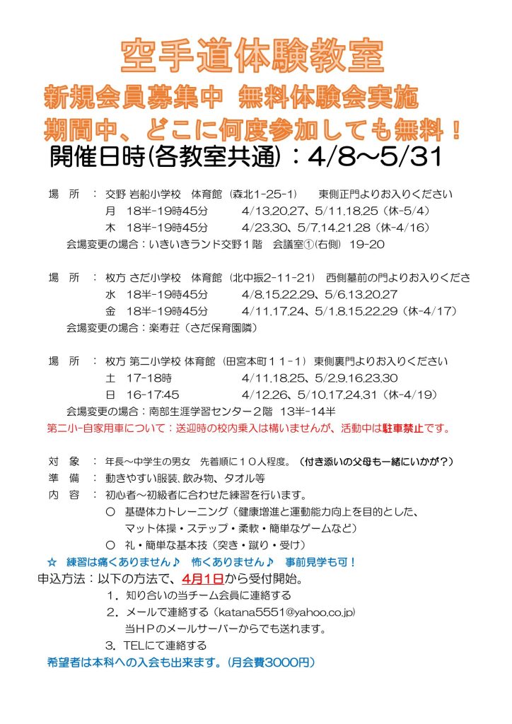 2026/04/01~5/31 各教室 無料体験 下記要項で行います。申し込みをお待ちしております。約1ヶ月半の間、一緒に頑張ってみませんか? 交野-岩船小学校教室 枚方-さだ小学校教室 枚方-第二小学校教室 申込は下記方法どれでも可メールフォーム
